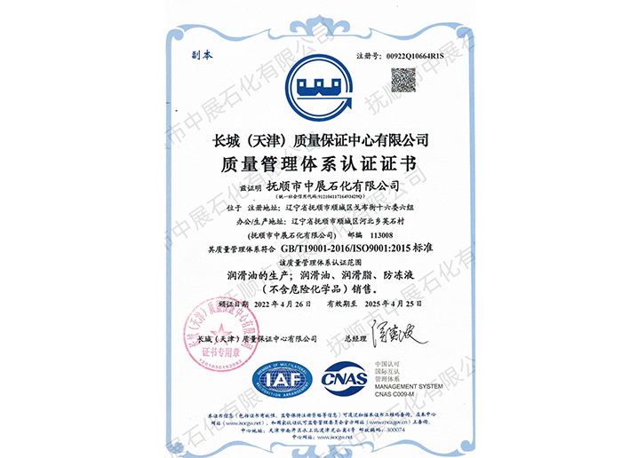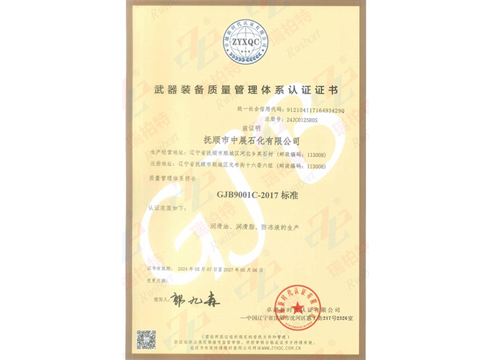 本公司是GB/T19001-2016/ISO 9001:2015標準質量體系認證單位(注冊號:00922Q10664R1S),是GJB9001C-2017標準武器裝備質量管理體系認證單位。撫順在上個世際五十年代就已是我國軍用油脂的生產基地,本公司正在發(fā)揚和繼承這一優(yōu)良傳統(tǒng),全力投入于各種軍用、航空油脂的生產與研發(fā)。
